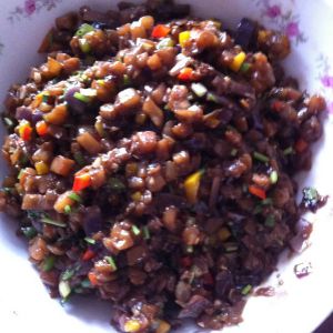 放葱,然后放入老抽,等一小会,在放入适量的面酱(这个要根据你的茄子多少来算)