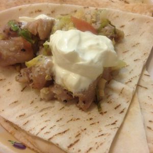 舀上两勺烤鱼放在塔克皮上,配搭上酸奶油,把皮卷起来,就可以享用这份混搭美味了