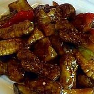 锅中留少许油,放点糖在加入葱蒜,倒入土豆,茄子翻炒在加入尖椒,在倒入少许水淀粉