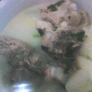 把煮排骨的水倒掉,在加水煮,煮到汤变奶色