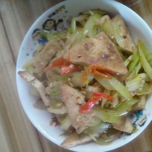 下油,姜蒜爆香,西芹辣椒下锅翻吵,煎好的豆腐下锅翻吵,放盐,味精。