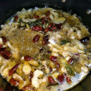 另起一锅烧干,不用油,下干红椒,花椒,中小火炒一会,炒至有香气飘出就可以了。关火待用。