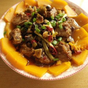 排骨冷水泡10min后擦干,南瓜切片,辣椒、大蒜、香葱切好!如图,材料准备好!