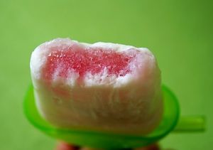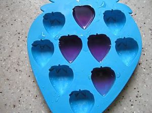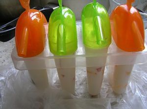 把牛奶鲜奶油混合的液体倒入冰棍模,至三分之二就可以了,再加入先前切好的果冻,没满的再加液体填满。