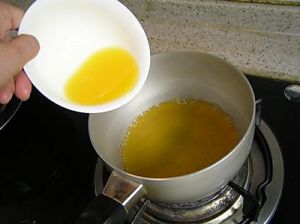 先做夹心层:用清水60ML泡菓珍,50ML加入小锅中煮开,10ML化开白凉粉,再倒入小锅中一起煮开。