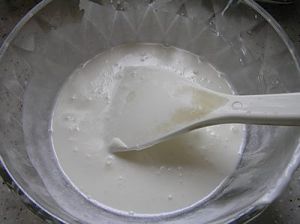 牛奶加入三分之二糖加热熔化备用。鲜奶油加剩下的三分之一糖打发,至六成发,六成发是刚开始出现纹路的状态,然后加入到牛奶中混合。