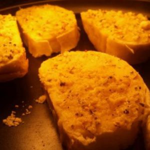 馒头切片,调料和橄榄油拌匀,抹在馒头片上,撒上芝士粉