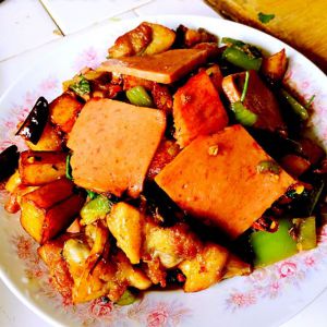 依次放入鸡块,土豆和午餐肉翻炒,放入适量盐和老抽,最后撒香菜翻炒一下