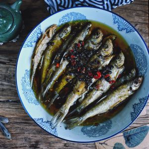 将炒好的调料倒入炸过的鱼里,油的量以能淹没鱼为准,自然冷却后盖保鲜膜,放冰箱冷藏浸泡4天