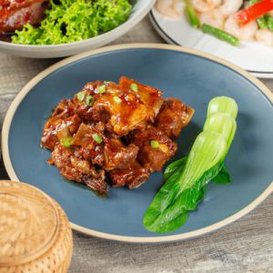 把焖熟的排骨倒入锅中,翻炒均匀,大火收汁,淋少许水淀粉出锅即可。