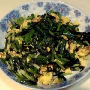 放一些盐,继续翻炒。韭菜多炒一会可以减淡辛辣的味道。