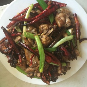 锅内再倒少许油,放入干辣椒翻炒,再倒入鸡块翻炒,加葱,蒜翻炒后起锅。