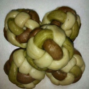 把发好的面团分成四等份儿,取一份加入抹茶粉,取一份加入巧克力粉。分成大小相同的剂子,戳成如图所示的长条,摆成井字逆时针压一圈,顺时针转一圈,收尾藏塞进肚子里,反转整好形。