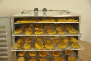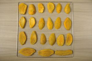 放进风干机里,设定温度58°,时间9个小时,烘干过程要翻转一下,不然会粘住网格,时间越长口感越硬