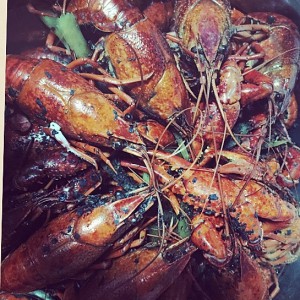 龙虾放入蒸锅,撒一点罗勒碎,加入姜片。