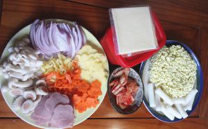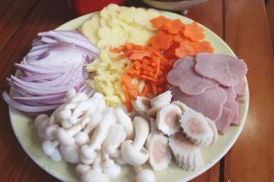 洋葱切丝,土豆、胡萝卜切薄片后,用模具切出花型,切花剩下的土豆胡萝卜切丝,(切花这部可省略,我是为了凹造型),白玉菇洗净摘成小朵,火腿切片(钟爱花型的我又在凹造型了),鱼卷切片。
