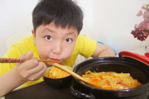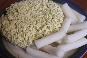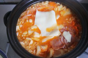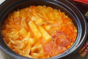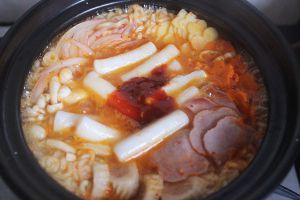 加入拉面,年糕条(可事先烫一下),韩国辣酱,少许糖以及拉面里的调味包,一边煮一边轻轻翻拌,防止粘锅。