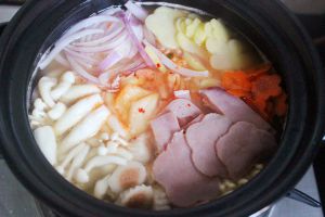 放入泡菜,土豆,胡萝卜,白玉菇,洋葱,火腿片,鱼卷。