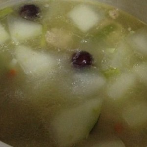 两小时后,加入冬瓜,葱段,再煮半小时左右。加入盐,鸡精。即可关火。