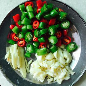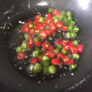 青红辣椒 小米椒切小段(喜欢辣的就小米椒多放点,青红辣椒是不怎么辣的)/姜切丝/蒜随意切/备用