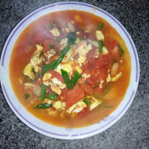 放西红柿,米醋翻炒片刻,加入鸡蛋和葱花 盐,就可以出锅了。