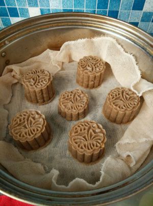 因为面团里含有油,所以不会出现不易脱模的情况。放蒸屉上,放好后用周边的屉布盖在绿豆糕上。