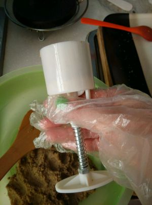 拿出月饼模具,用手捏一团面团塞进模具里,压实。