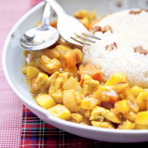注入没过食材的沸水后大火至沸腾,煮10分钟后调入咖喱,顺一个方向搅拌均匀后继续煮至水分减半,将另外一半洋葱碎加入略翻炒后熄火,将蒸好的米饭搅拌均匀后盛在盘子里,浇入做好的咖喱鸡即可