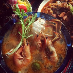 加入香茅,香叶,冬阴功酱料后煮到口蘑可以食为止,这个时候可以分别将虾,蟹,蛤蜊放入,因为海鲜特别容易熟,所以5-到10种就可以起火了,最后放入青柠调味。
