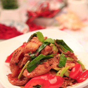 下青蒜、红椒翻炒。