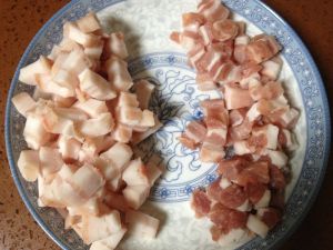 五花肉切丁,肥瘦分开放。(刚买的五花建议入冷冻冻半个小时,会比较好切;一直冷冻的则用水泡半个小时,不要全部化完会比较好切)