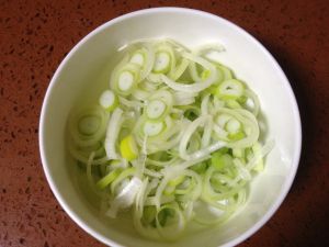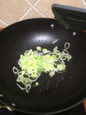 葱切成葱花。我不喜欢吃葱,所以葱白和绿色部分都是混在一起最早下锅的。喜欢吃葱的朋友可以先炒葱绿,葱白在最后即将出锅的时候放,葱味会更足些。