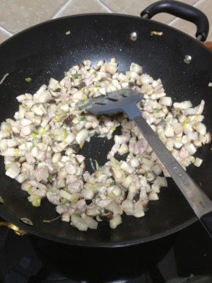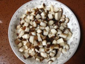 先放切好的肥肉丁,将肥肉丁里的油逼出来,炒到肥肉丁略缩小,然后放瘦肉丁翻炒,再放入香菇丁。