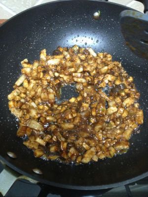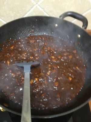 然后倒入稀释好的干黄酱,熬炒几分钟,就可以关火了。熬炒过程中要不停搅动,防止粘锅。我用的不粘锅,感觉比较好控制。