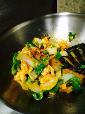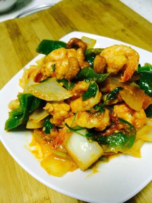 倒入煮好的咖喱虾球,将香芹用手折小段丢入锅中,翻炒几下,倒入腰果,出锅。
