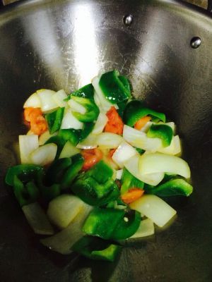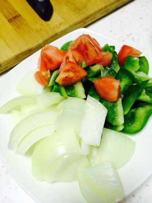 洋葱、甜椒切小块,西红柿对半切开,切合适大小块备用。