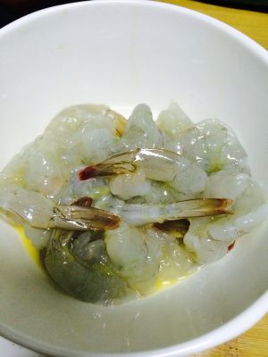 腌制好的虾肉倒掉料酒,取适量鸡蛋液抓匀。