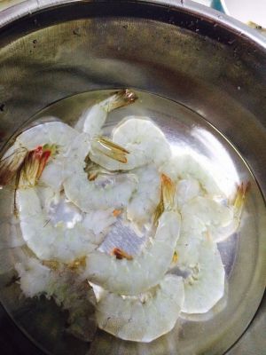 买好的青虾,用清水淘洗两遍,去掉虾头和虾壳,保留虾尾。
