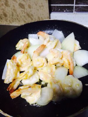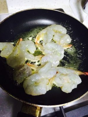 锅里放适量黄油,小火等黄油化开后,虾肉捏一点盐搅拌,倒入锅内,用筷子翻面将虾肉煎变色成虾球。