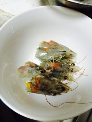 虾头剪去虾剑、虾须,装碗备用。