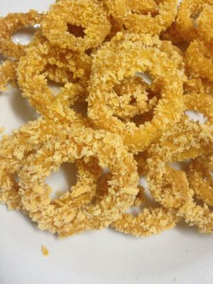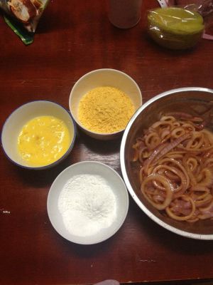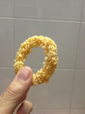夹起洋葱先(裹面粉)再(裹鸡蛋液)再(裹面包糠)要每个地方都裹到面包糠。这样炸出来了就很漂亮了。