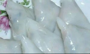 取之前用米浆蒸好的粉皮一张,卷起后切大概一指长度