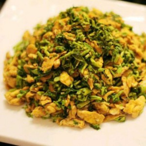 把鸡蛋打成蛋花加入一勺盐,再加入切好的香椿。