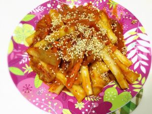 加入年糕和韩国辣酱,入锅后翻炒,直至年糕变软,汤汁收浓后起锅,撒上炒好的芝麻