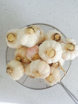 首先把新蒜剥皮,留一层薄皮即可。剪去须。然后找个干净盆,里面加入清水在放两大勺盐,把蒜放里面泡上两天。