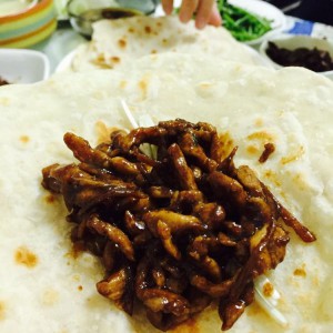 我是先全部擀好薄饼再烙,结果有几张粘在一起,撕开的时候变型了,可以擀好的面皮上涂一层油,或者拍上面粉