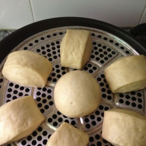 二次发酵结束,就开火蒸15-20分钟,蒸好后,关火,5-10分钟后开盖。热腾腾的馒头出炉了。由于这次面粉不太够,一不小心水放多了点,面揉得不够光滑。这次蒸出来的馒头表面不够光滑。