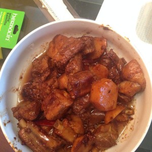 放入葱 姜 大料 胡椒 干辣椒,撒入料酒焖半分钟,加入没过肉的水,加入之前煎好的土豆块,倒入李锦记红烧汁