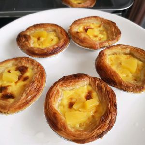 黄桃切小粒。同时调好蛋液,比列按食材数量给,搅拌搁置。
