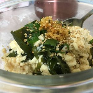 把豆腐,裙带菜和混合调味料拌匀。